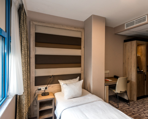 Single room is spacious decorated in cool tranquil colors. It is widely enough for one person to stay, and has a small area to work.